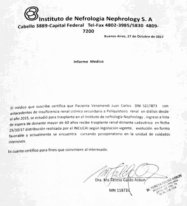 La Municipalidad de General Paz, pone en conocimiento de toda la población, el informe médico acerca de la salud del Intendente Municipal en uso de licencia, Sr. Juan Carlos Veramendi, recibido directamente del Instituto de Nefrología Nephrology S.A. de la ciudad de Buenos Aires. El mismo se encuentra estable y evoluciona positivamente según lo previsible en estos casos. Se adjunta copia del mencionado informe.